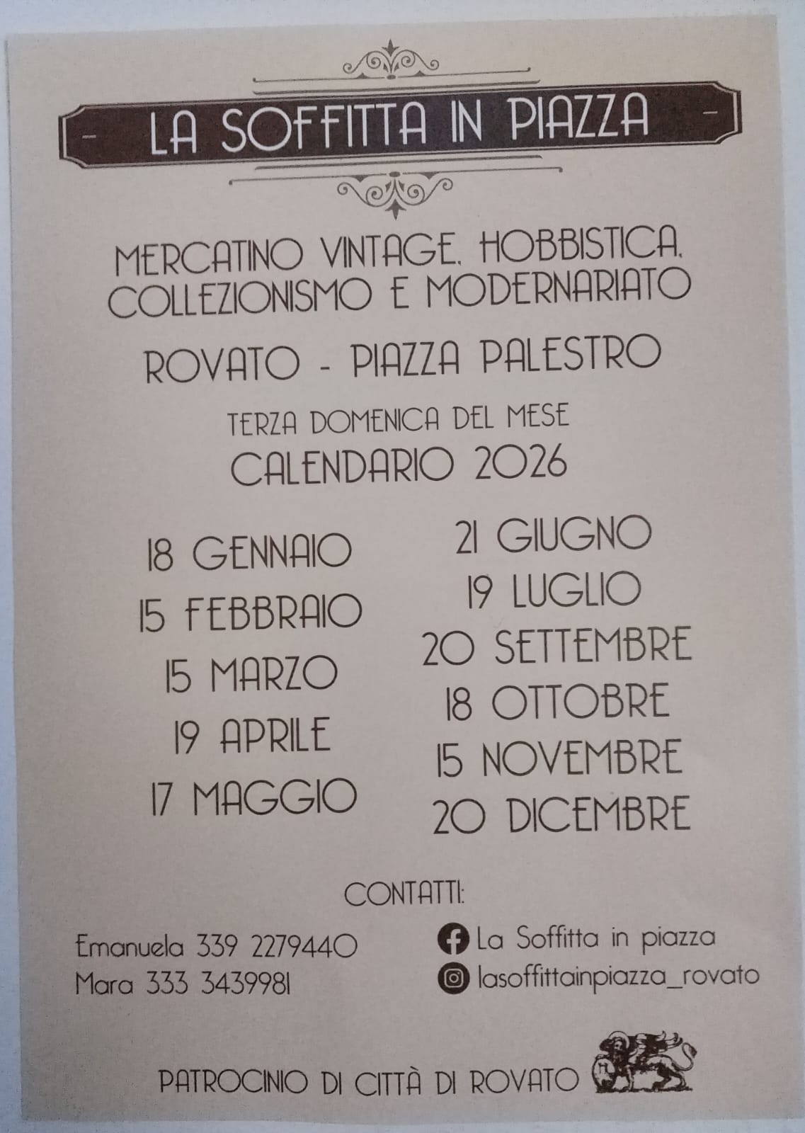 Nel cuore del paese di Rovato 70 espositori vi aspettano Domenica 15 e ogni terza Domenica del mese con Vintage, usato, modernariato, collezionismo, libri, quadri bigiotteria, hand made e tanto altro.