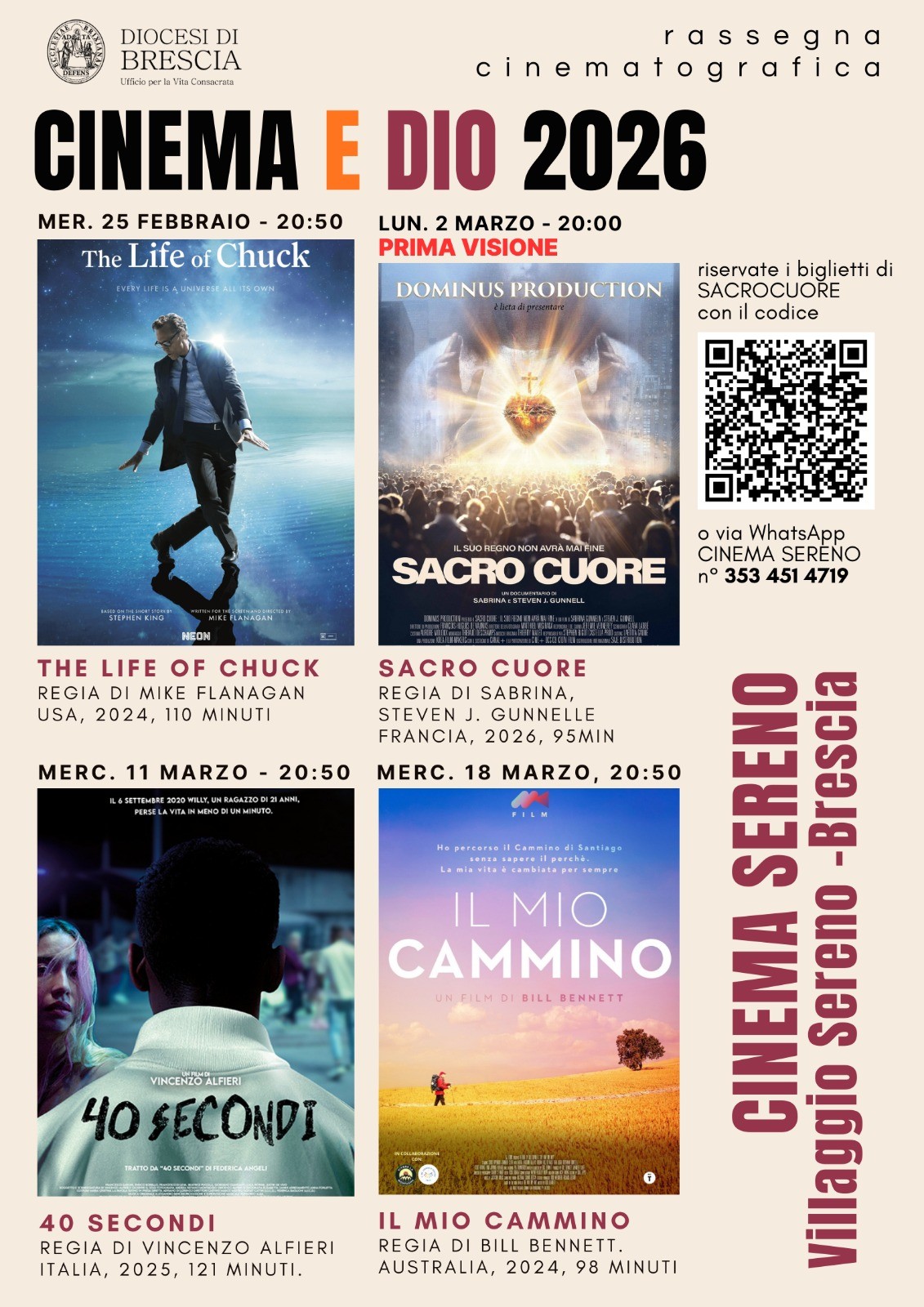 Tutte le proiezioni si terranno al Cinema Sereno di Brescia alle ore 20.50, ad eccezione della prima visione di Sacro Cuore di lunedì 2 marzo, in programma alle ore 20.00.