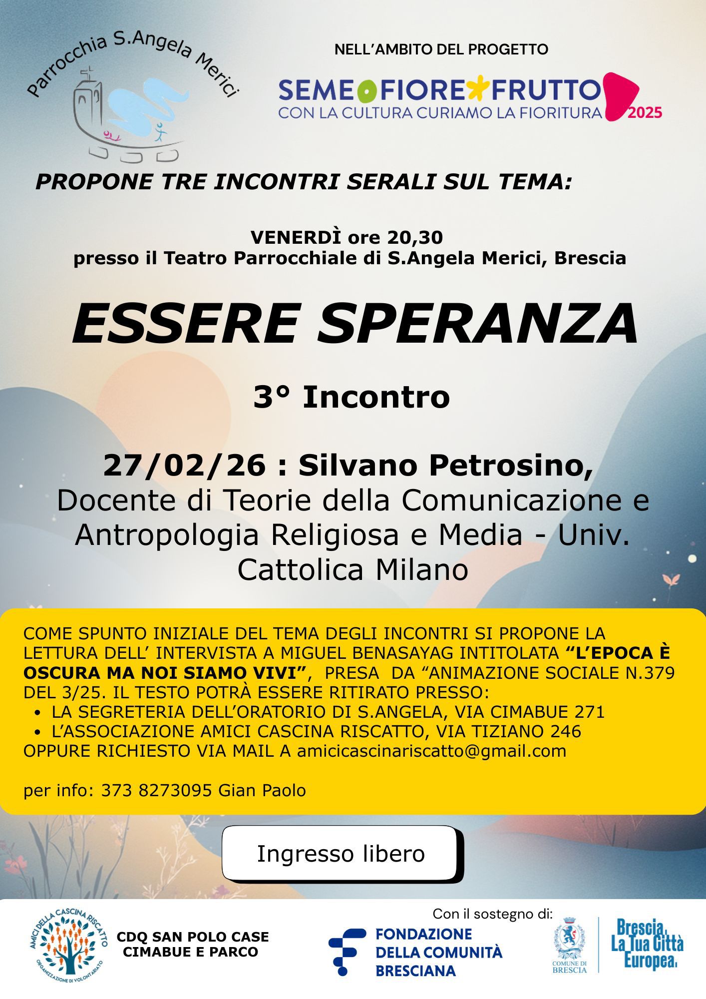 Incontro con il filosofo Silvano Petrosino dal titolo "Essere speranza", nell'ambito del progetto "Seme. Fiore. Frutto 2.0".