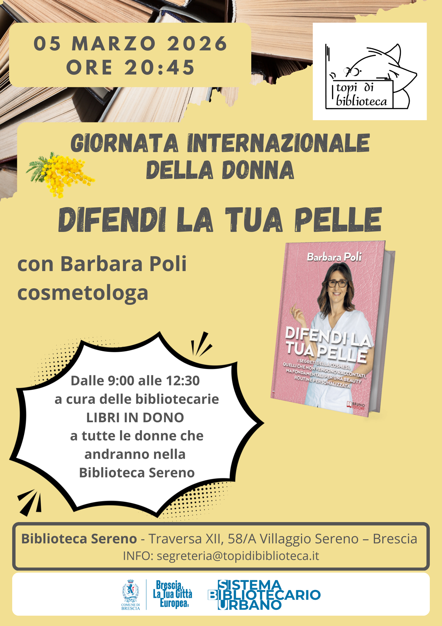 L'Associazione culturale "Topi di biblioteca ODV" in occasione della Giornata Internazionale della donna, promuove l'incontro su "Difendi la tua pelle"
