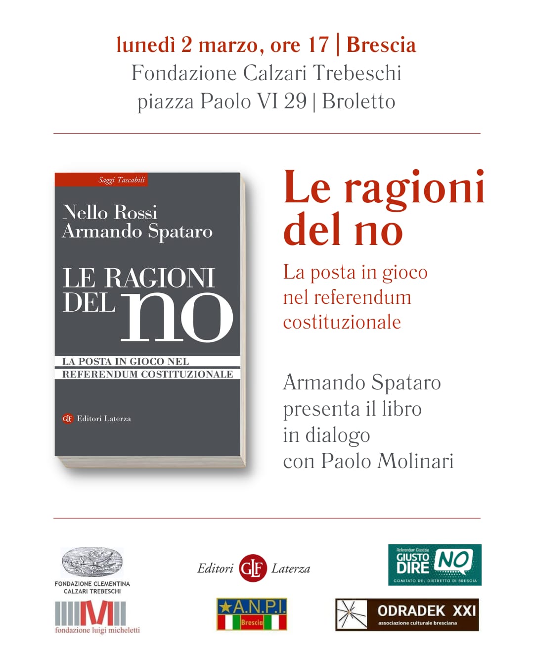 Presentazione del libro di Nello Rossi e Armando Spataro "Le ragioni del no - La posta in gioco nel referendum costituzionale", incontro pubblico di approfondimento e confronto sull'appuntamento referendario del 22 e 23 marzo, organizzato dalla Fondazione Calzari Trebeschi in collaborazione con Editori Laterza, Giusto dire NO-Comitato del Distretto di Brescia, Fondazione Luigi Micheletti, ANPI Brescia, Odradek XXI.