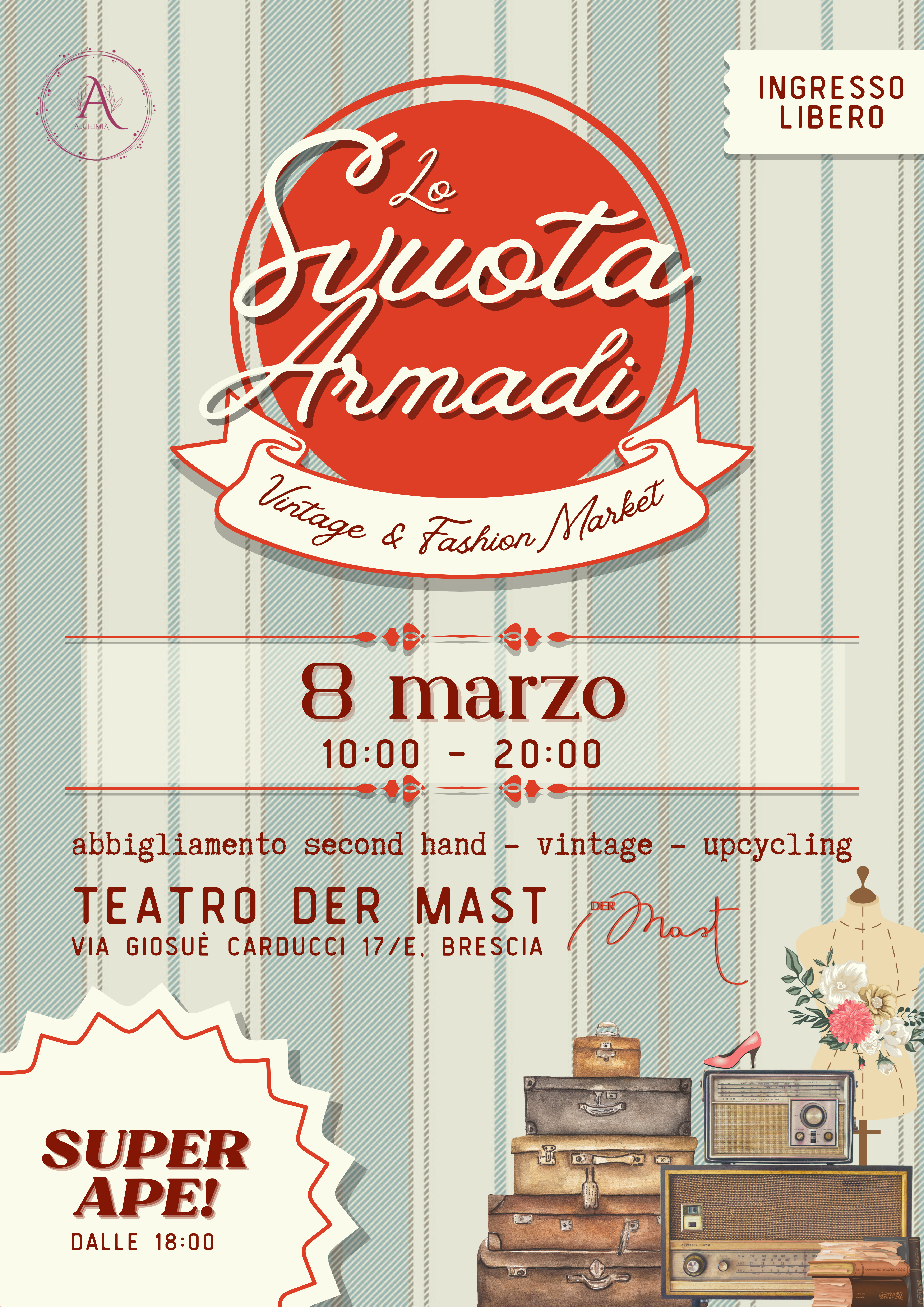Il Teatro Der Mast di Brescia ospiterà una nuova edizione organizzata da Alchimia APS dello "Svuota Armadi", l'evento dedicato alla moda sostenibile, al vintage e alla creatività, capace di unire stile, socialità e impegno solidale in un'unica giornata.