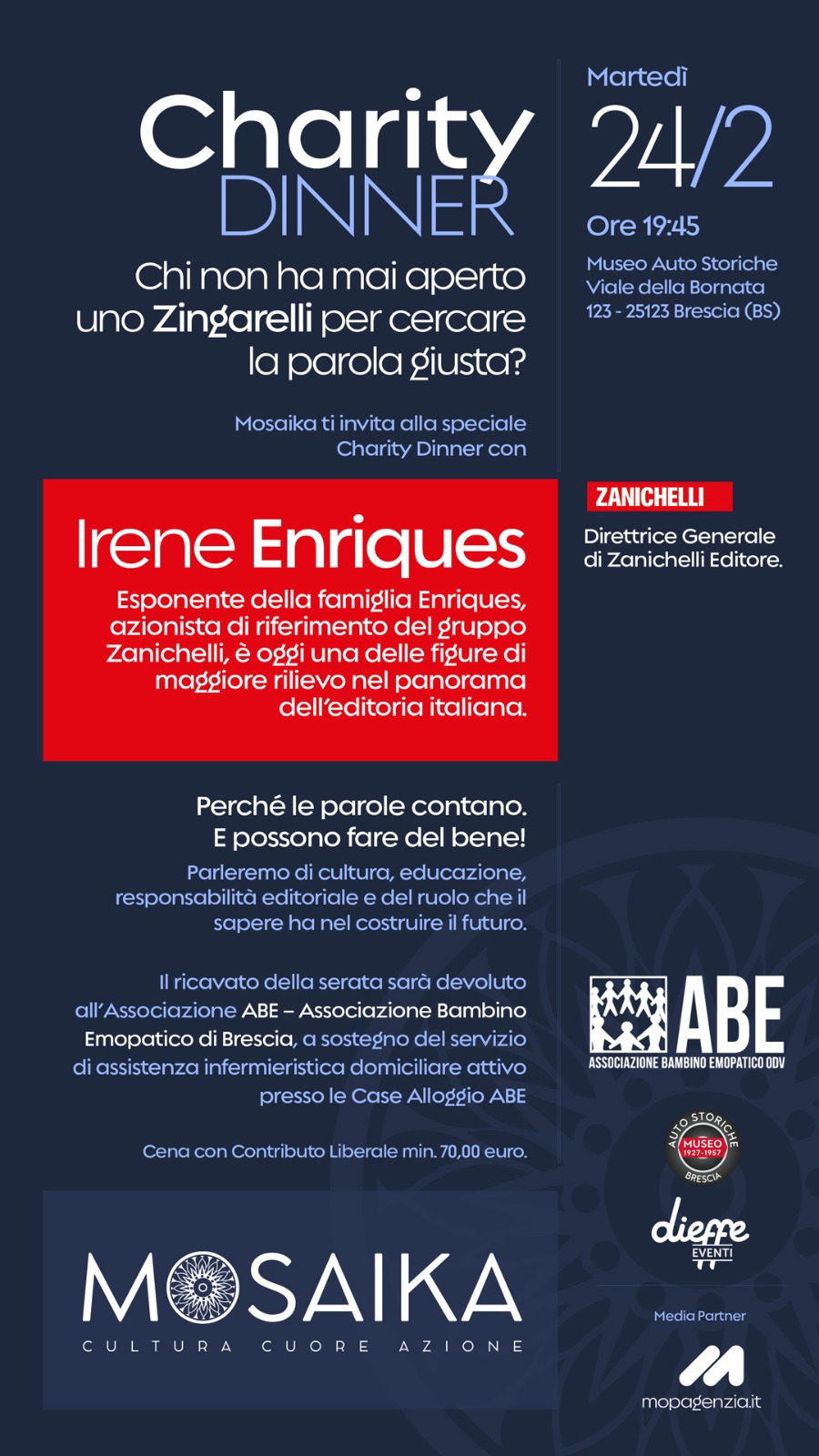 Con questo spirito, l’Associazione Mosaika organizza il suo secondo Charity Dinner presso il Museo Auto Storiche di Brescia, Martedì 24 Febbraio 2026 dalle ore 19.45: una serata che unisce convivialità e riflessione culturale, ponendo al centro il ruolo delle parole nella costruzione del futuro.