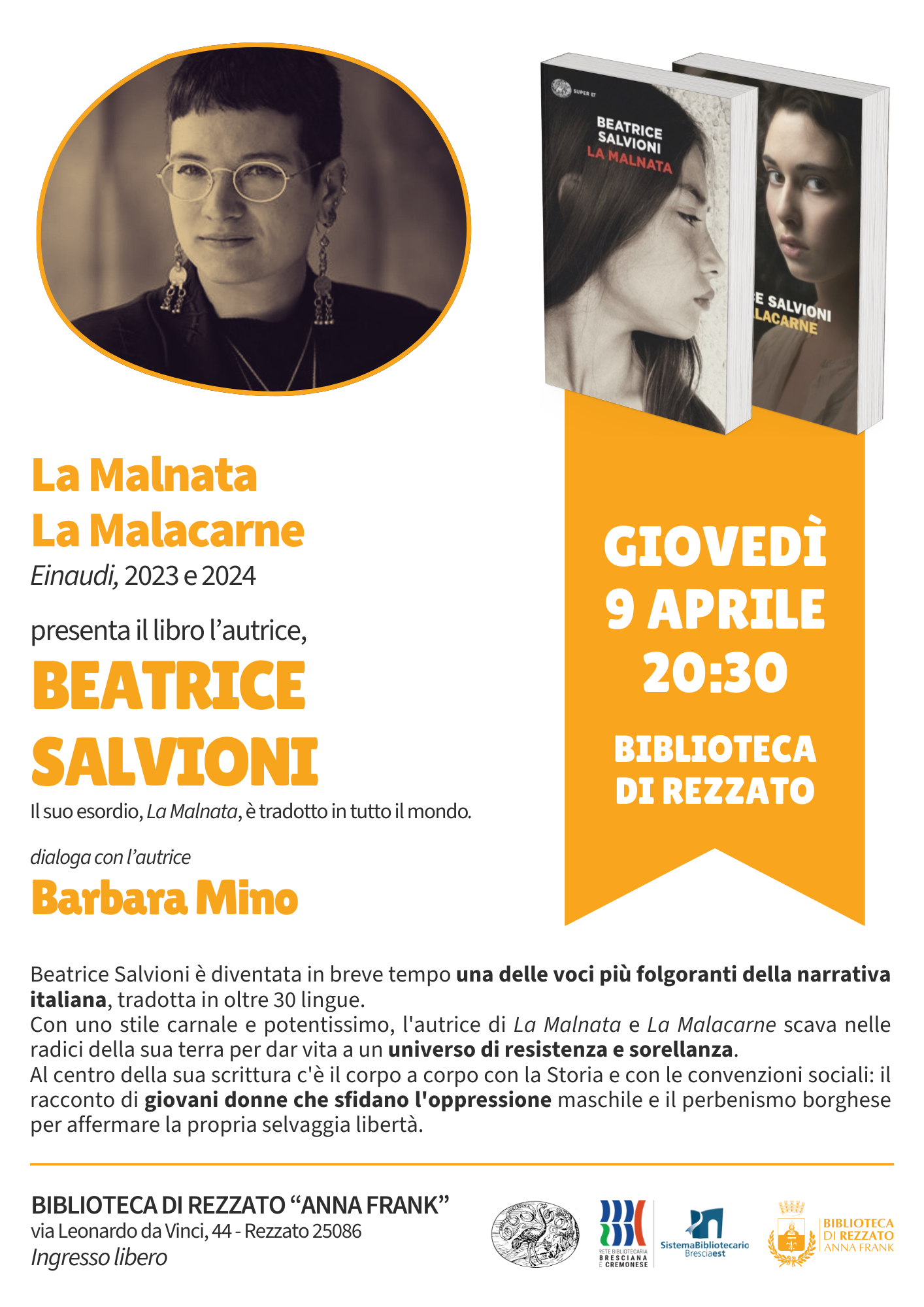 La Biblioteca di Rezzato "Anna Frank" ospita Beatrice Salvioni, una delle voci più folgoranti della narrativa italiana contemporanea.