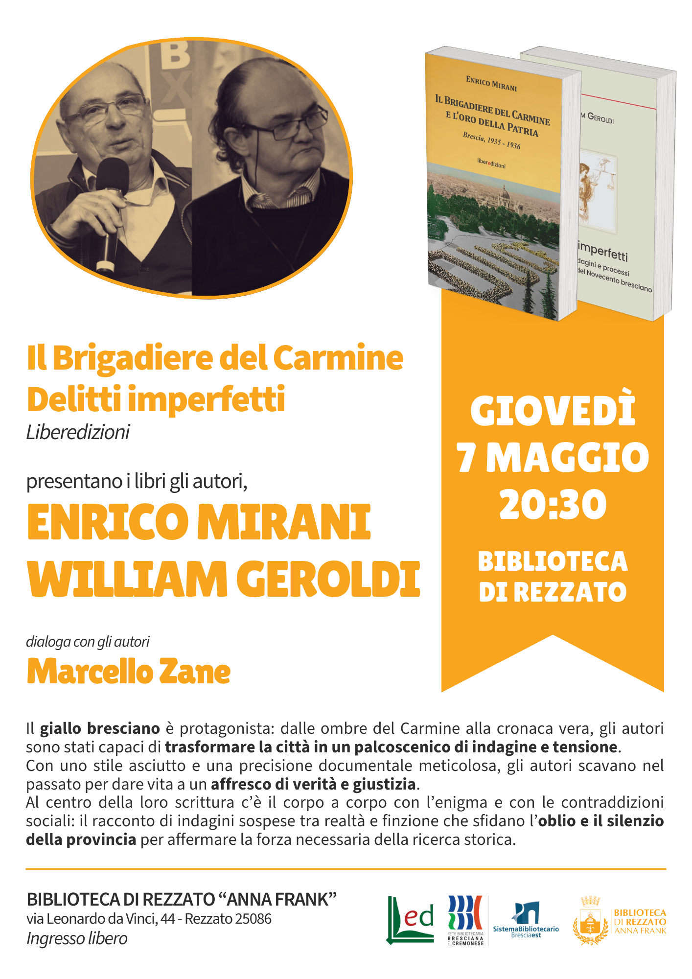 Un appuntamento imperdibile per gli amanti del mistero e della storia locale: la Biblioteca di Rezzato presenta una serata dedicata al giallo bresciano con gli autori Enrico Mirani e William Geroldi.