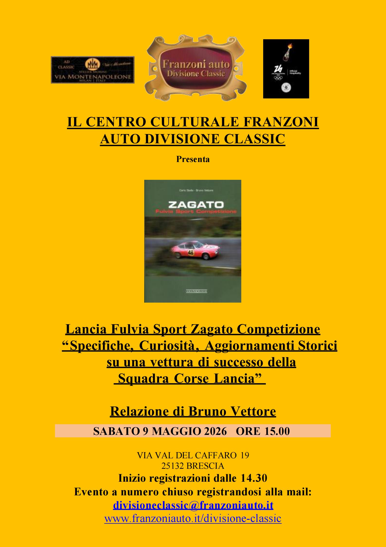 Terzo Evento 2026 del Centro Culturale Franzoni Auto Divisione Classic Lancia Fulvia Sport Zagato Competizione "Specifiche, Curiosità, Aggiornamenti Storici su una vettura di successo della Squadra Corse Lancia" Relazione di Bruno Vettore SAVE THE DATE: 9 MAGGIO 2026 Il nuovo imperdibile appuntamento con le iniziative 2026 del Centro Culturale Franzoni Auto Divisione Classic di via Val del Caffaro 19 a Brescia.