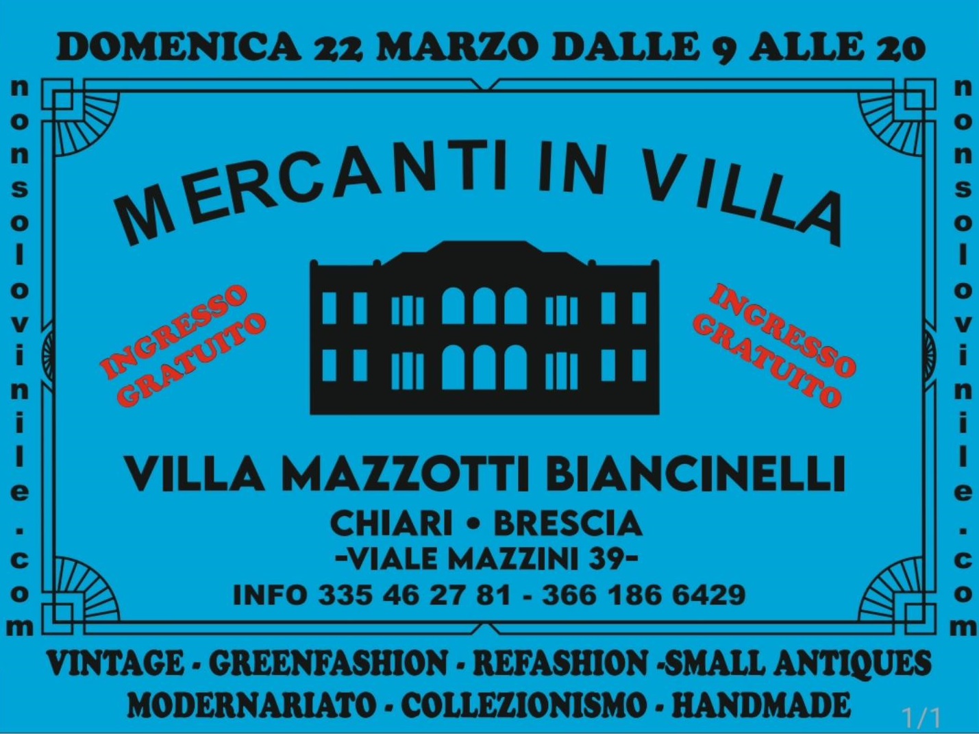 Mostra mercato Villa Mazzotti Biancinelli a Chiari BS , villa pregevole tra le più belle del nostro territorio esempio di architettura in stile Liberty ed arricchita da giardini all'Italiana sarà la sede del nuovo vintage market che ci riporterà ai tempi della "belle epoque". Domenica 22 marzo all'interno delle sale della villa liberty che fu la residenza di uno dei fondatori delle mille miglia si svolgerà la nuova edizione di mercanti in villa. Oltre 70 espositori distribuiti sui due piani dell'edificio vi accoglieranno con i loro allestimenti particolari, preziosi e rari.