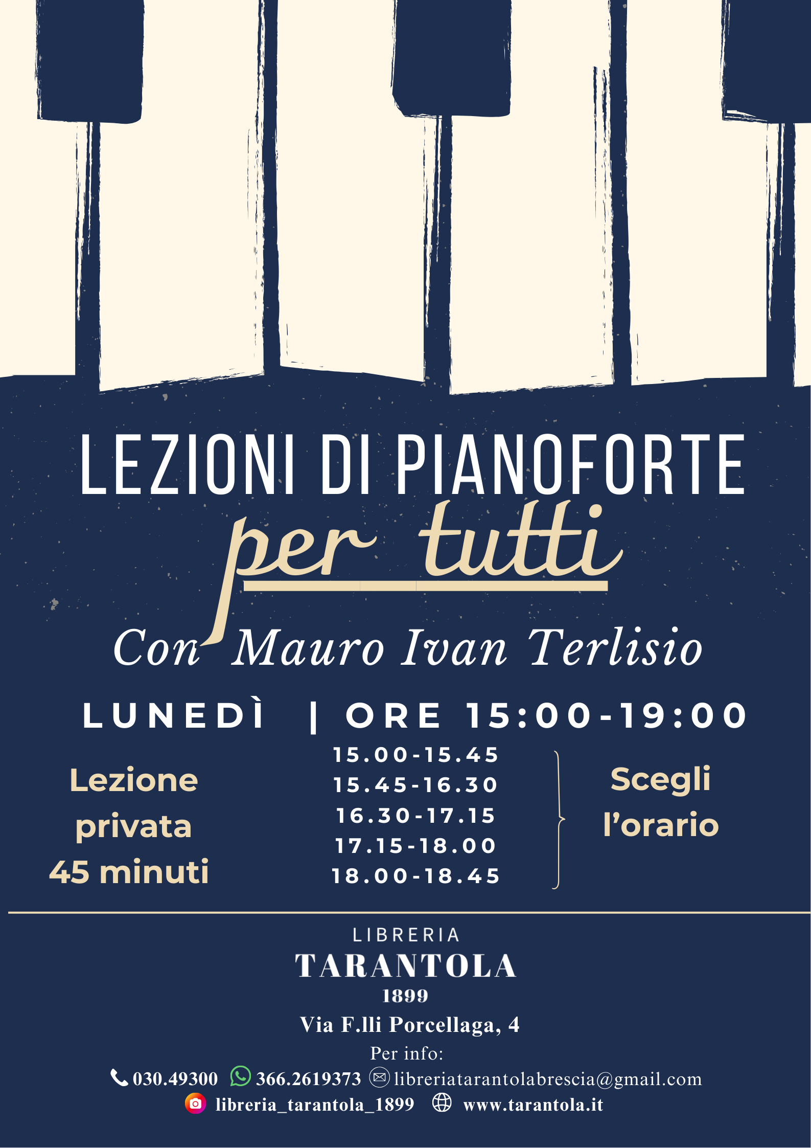 Il maestro Mauro Ivan Terlisio tiene lezione ogni lunedì per chi desidera avvicinarsi al Pianoforte: 45 minuti, dalle ore 15 fino a chiusura della Libreria, con il nostro pianoforte a coda.