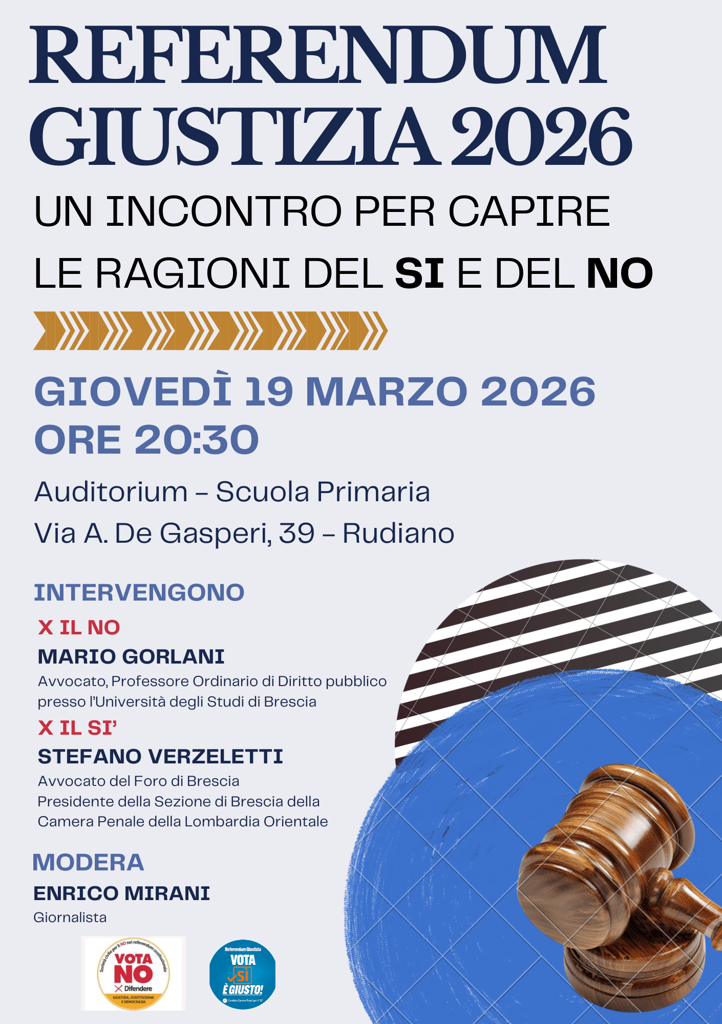 Intervengono: per il NO Mario Gorlani, avvocato, professore ordinario di diritto pubblico all'Università degli Studi di Brescia; per il Sì, Stefano Verzeletti, Avvocato del Foro di Brescia, Presidente della sezione di Brescia delle Camera Penale della Lombardia Orientale.