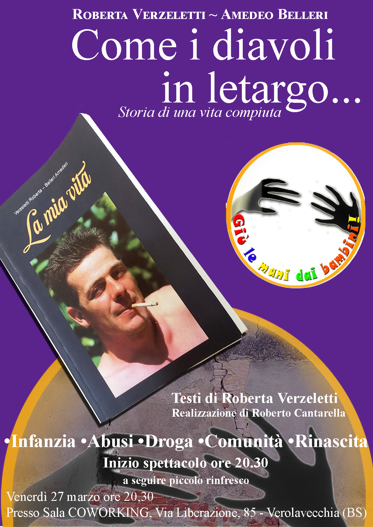Infanzia, Abusi, Droga, Comunità e Rinascita sono i contenuti di questo spettacolo-presentazione, una realizzazione a cura di Roberto Cantarella da testi tratti dal volume di Roberta Verzeletti.