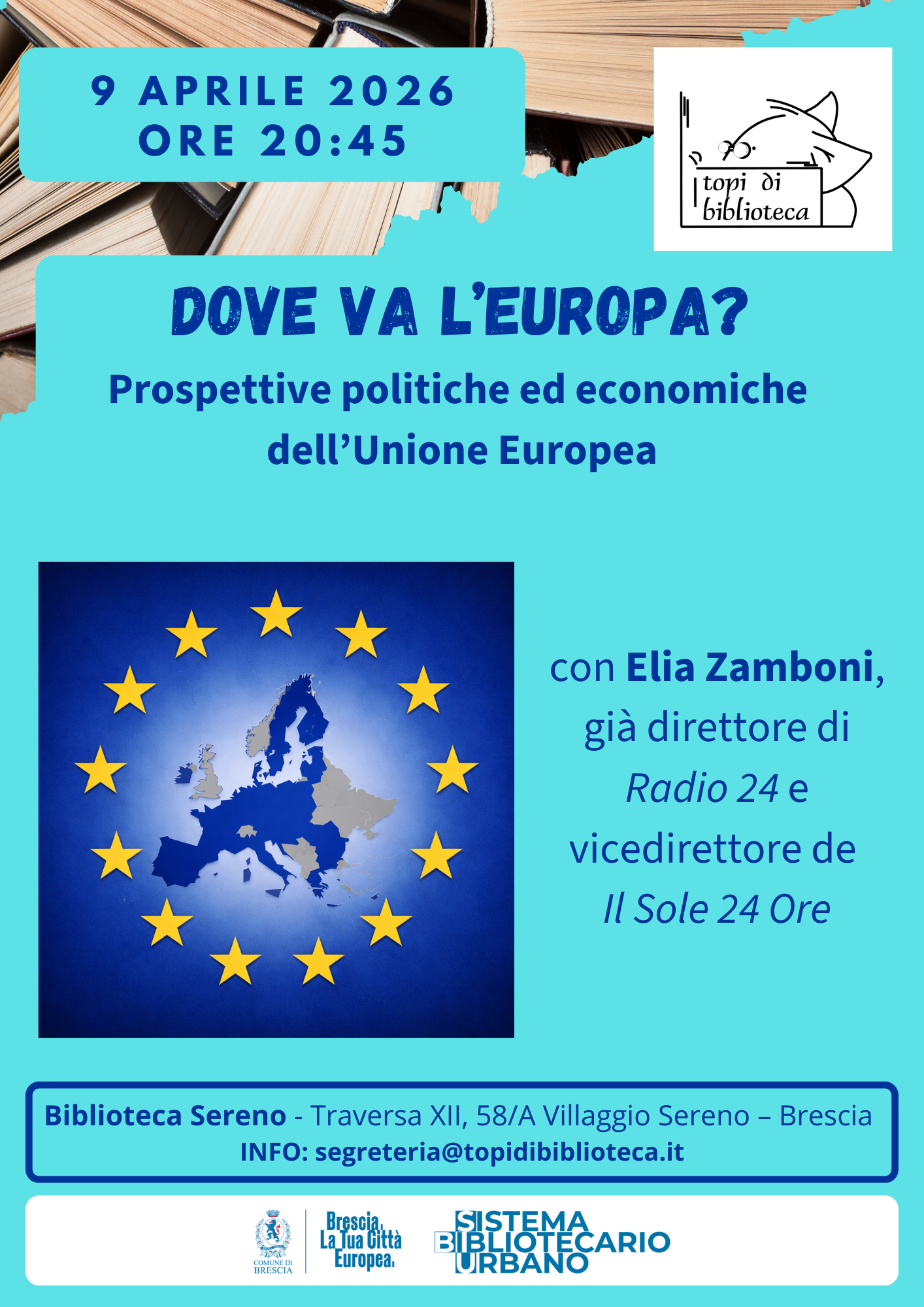 L'Associazione Culturale "Topi di biblioteca-ODV" propone un incontro su un tema assolutamente attuale a causa dei repentini mutamenti che la quotidianità ci mette di fronte. "Dove va l'Europa? Prospettive politiche ed economiche dell'Unione Europea".