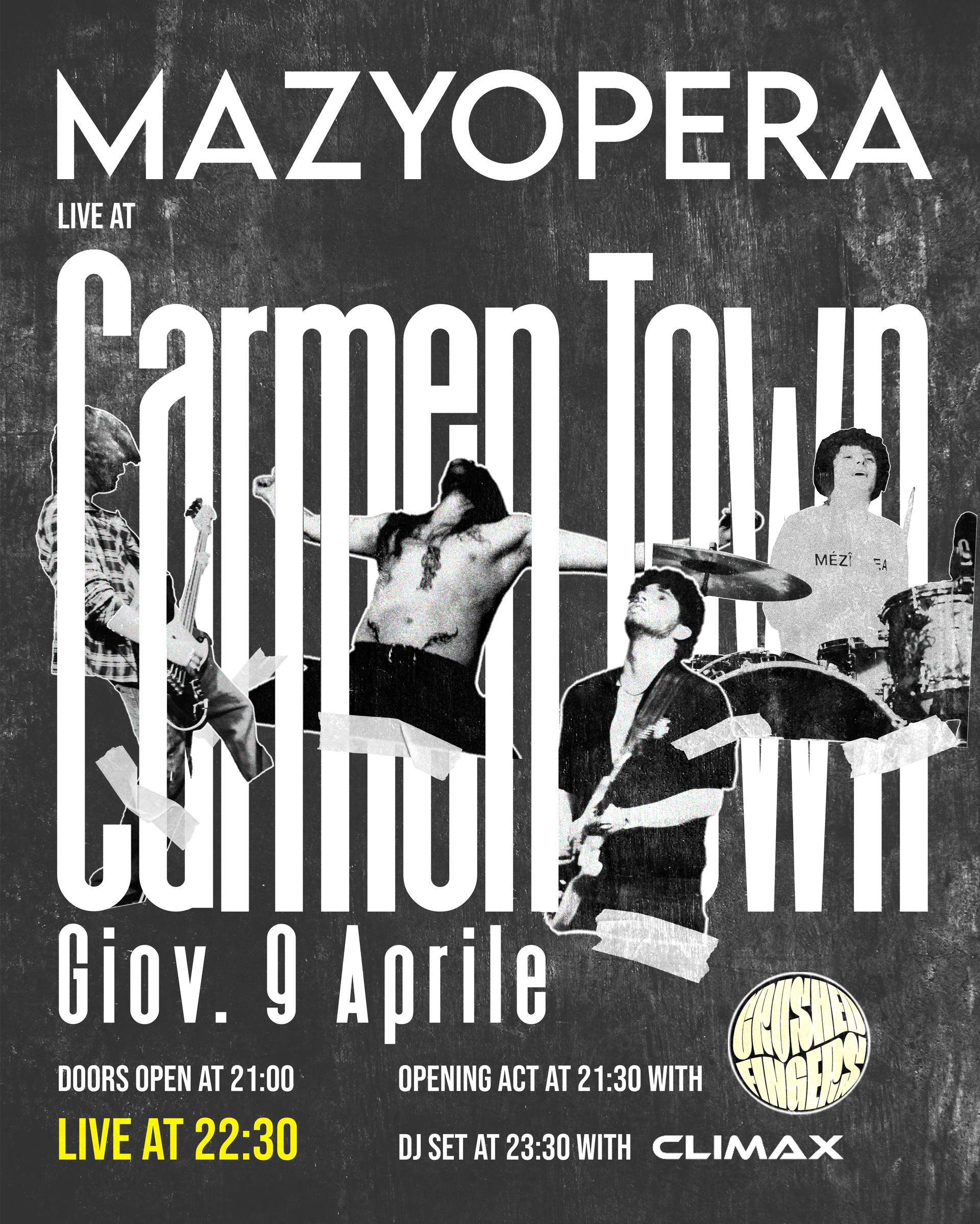 I MAZYOPERA tornano a casa: la band bresciana sale sul palco del Carmen Town per quello che si preannuncia come uno degli appuntamenti live più attesi della primavera in città. Un ritorno alle origini per la formazione che ha saputo conquistare palchi nazionali, portando dal vivo tutta l'energia, la fame di futuro e la spontaneità che contraddistinguono il loro sound.