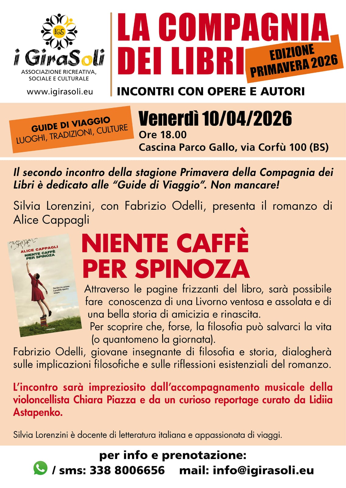 L'associazione IGS IGiraSoli, in collaborazione con CieliVibranti e con il patrocinio del Comune di Brescia, propone la presentazione del libro di Alice Cappagli "Niente caffè per Spinoza".