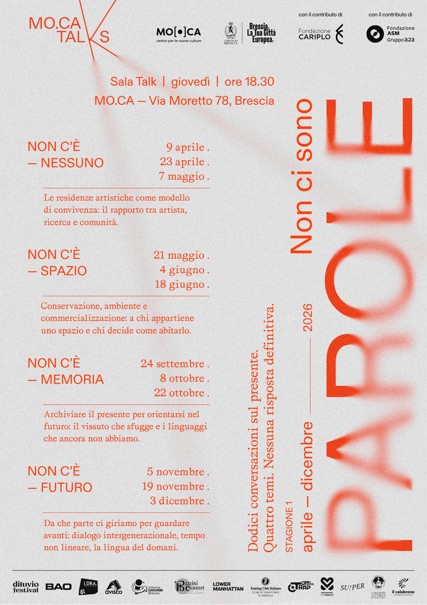 Mo.Ca inaugura un nuovo progetto: Mo.Ca Talks - Non ci sono parole, un ciclo di incontri pubblici co-prodotto con le realtà residenti di palazzo Martinengo Colleoni. Dodici conversazioni distribuite nell'arco di un anno, aperte alla città, gratuite e trasmesse in diretta streaming. Un appuntamento pensato per chi vuole capire di più, sul presente, sulla città che abita, sui fenomeni che la attraversano, e farlo insieme ad altri, in uno spazio che non è né un'aula né una conferenza, ma qualcosa di più simile a una conversazione tra persone che hanno cose da dirsi.