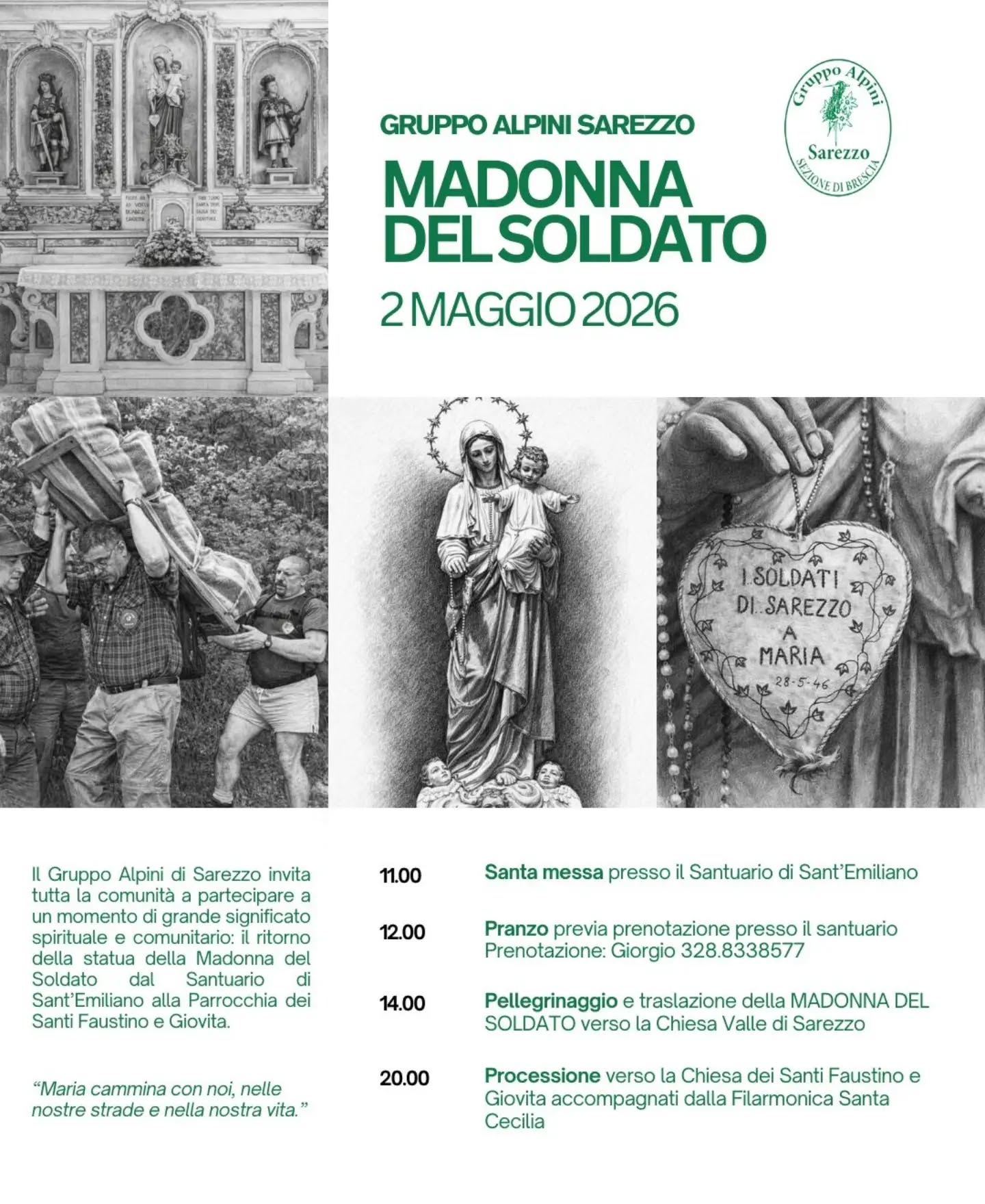 Da anni gli Alpini del gruppo di Sarezzo ogni 5 anni portano a valle la Statua, fatta come voto da mamme, spose, e sorelle dei soldati durante la seconda guerra mondiale.