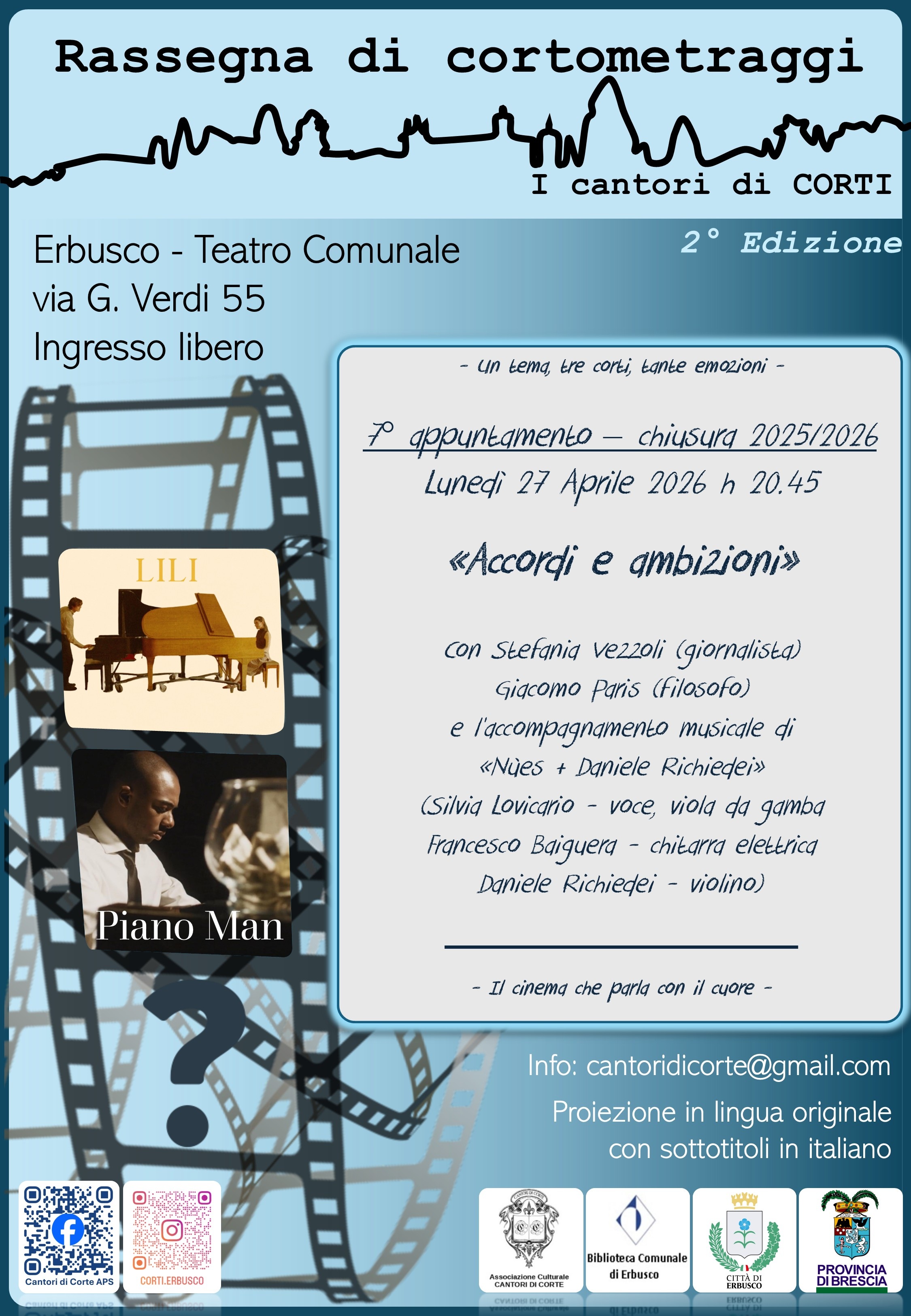 "Accordi e Ambizioni" è il titolo della 7^ e ultima serata di Cortometraggi edizione 2025-2026. La serata avrà un accompagnamento musicale a cura del gruppo Nùes (Silvia Levicario, voce e viola da gamba, e Francesco Baiguera, chitarra elettrica) e Daniele Richiedei (violino).