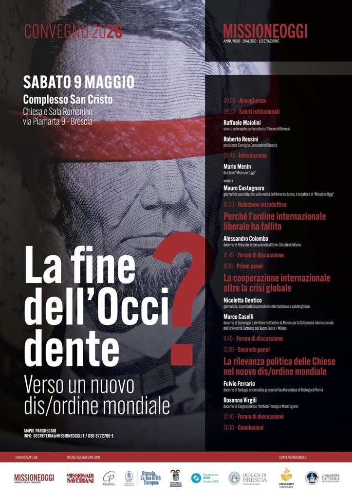 L’evento, organizzato da “Missione Oggi” in collaborazione con i Missionari Saveriani, il Comune di Brescia e con il patrocinio della Diocesi di Brescia e dell'Università Cattolica, vedrà alternarsi esperti di fama internazionale come Alessandro Colombo, Nicoletta Dentico e Fulvio Ferrario. Gli interventi tratteggiano il significato del fallimento dell'ordine liberale e la possibilità di un nuovo mondo fondato non sul predominio, ma sul rispetto reciproco, sulla solidarietà e sulla cooperazione per sconfiggere la fame e la crisi ecologica. È la narrazione di una transizione epocale e della capacità delle Chiese di farsi protagoniste di un’educazione alla pace che sia priorità assoluta per l’umanità.
