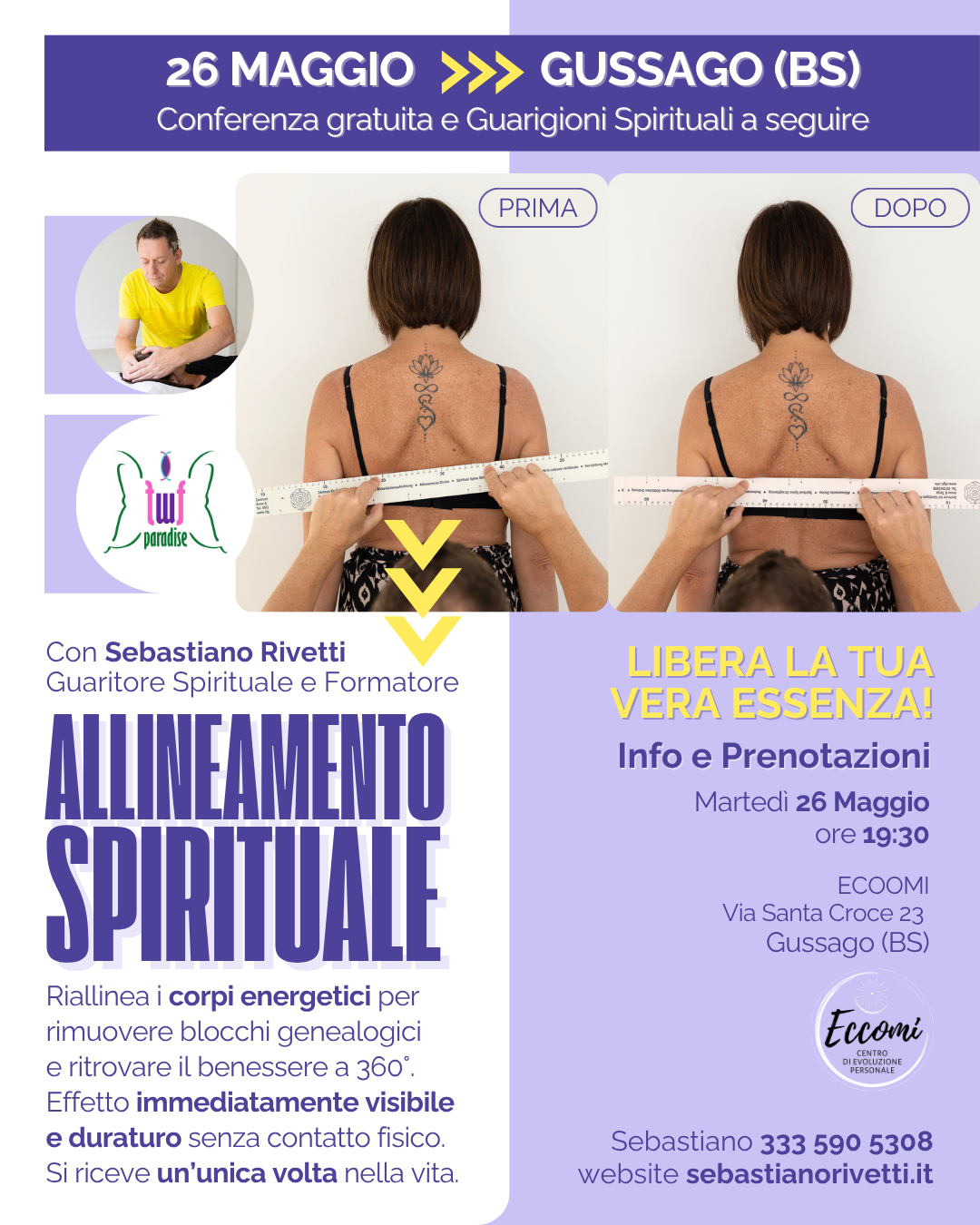 Conferenza Gratuita (30-40 min): Aperta a tutti, senza vincoli. Spiega l'Allineamento Spirituale, il riequilibrio del Plesso Solare (milza, fegato, pancreas, stomaco, intestino) e le Guarigioni Spirituali (metodo Filippino). Sarà possibile fare domande.