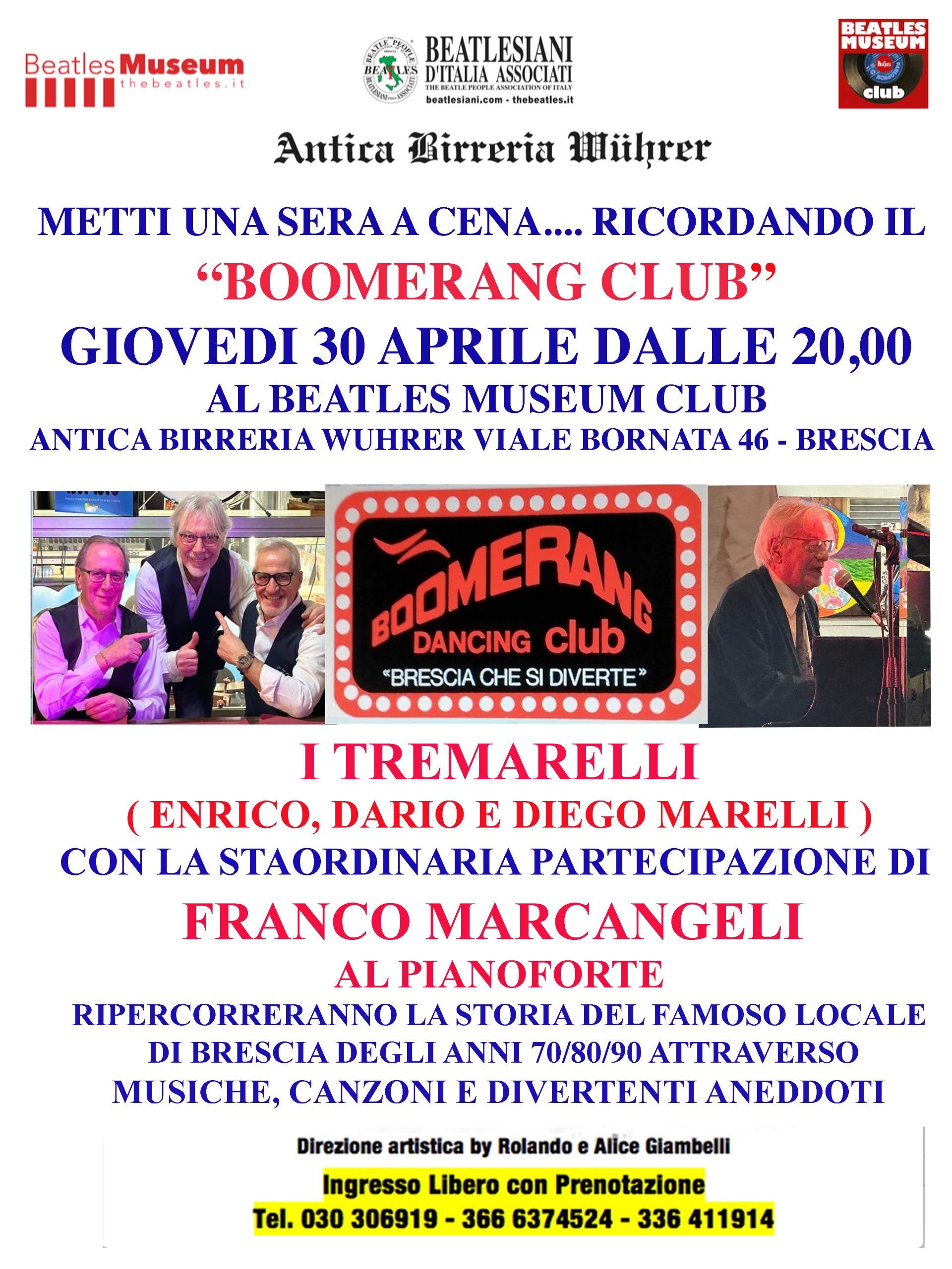 La serata vuole essere un tributo al Boomerang Club e ad Armando Marelli e sarà un’occasione per rivivere alcuni dei momenti più salienti ripercorrendo la storia del famoso Dancing Club degli anni 70’/80’/90’ di Via Triumplina a Brescia, in una rappresentazione musico teatrale, attraverso musiche e canzoni dal vivo, ospiti, gags e tanti divertenti aneddoti.